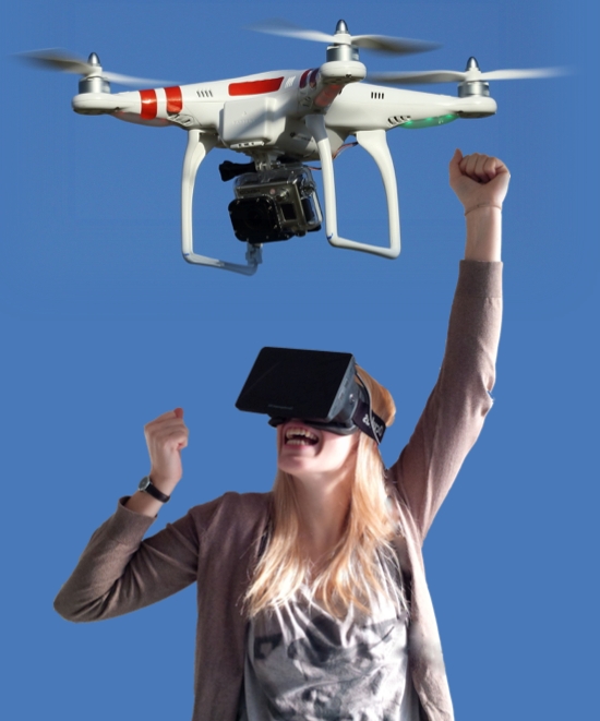 project is to enable a first- and/or third-person experience by combining a head-mounted display (HMD) with an unmanned aerial vehicle (UAV). A single or multiple drones track the person wearing the HMD and stream their stereo- or monoscopic video data to the full immersive display in real-time. Oculus Rift, Parrot AR.Drone, and DJI Phantom hardware are available and can be provided for this project.